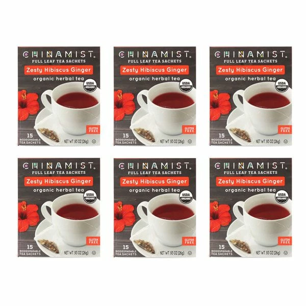 China Mist Organic Zesty Hibiscus Ginger Tea Sachets 6 Boxes 15 Count each